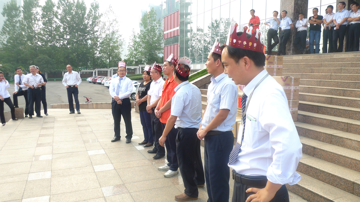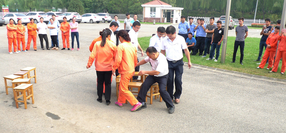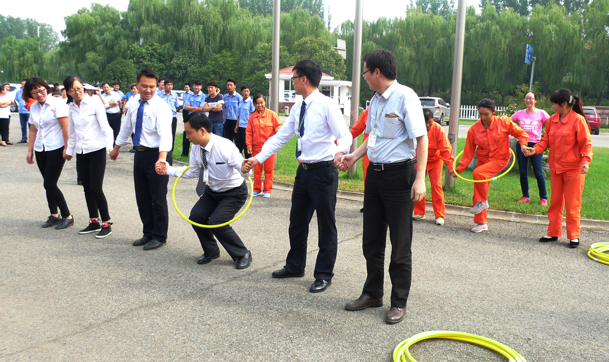 “钻圈”游戏:每十人一组,排成一队,大家手拉手,个子由高到低排列。听到指令后,第一个人立即从脚下拾起呼拉圈套在身上,再从头上穿出去,将圈迅速套到下一个队员身上,这名队员将双脚从圈中出来后,再如此照旧,依次向后传递。该游戏获胜者:经营部、计划部、镀膜部组成的联队。