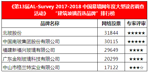 2018年3月10日,作为行业风向标的“全国铝门窗幕墙行业年会”在广州隆重召开,第13届“中国门窗幕墙行业年度大型读者调查活动”首选品牌排行榜正式揭晓,建筑玻璃行业各大品牌悉数亮相。