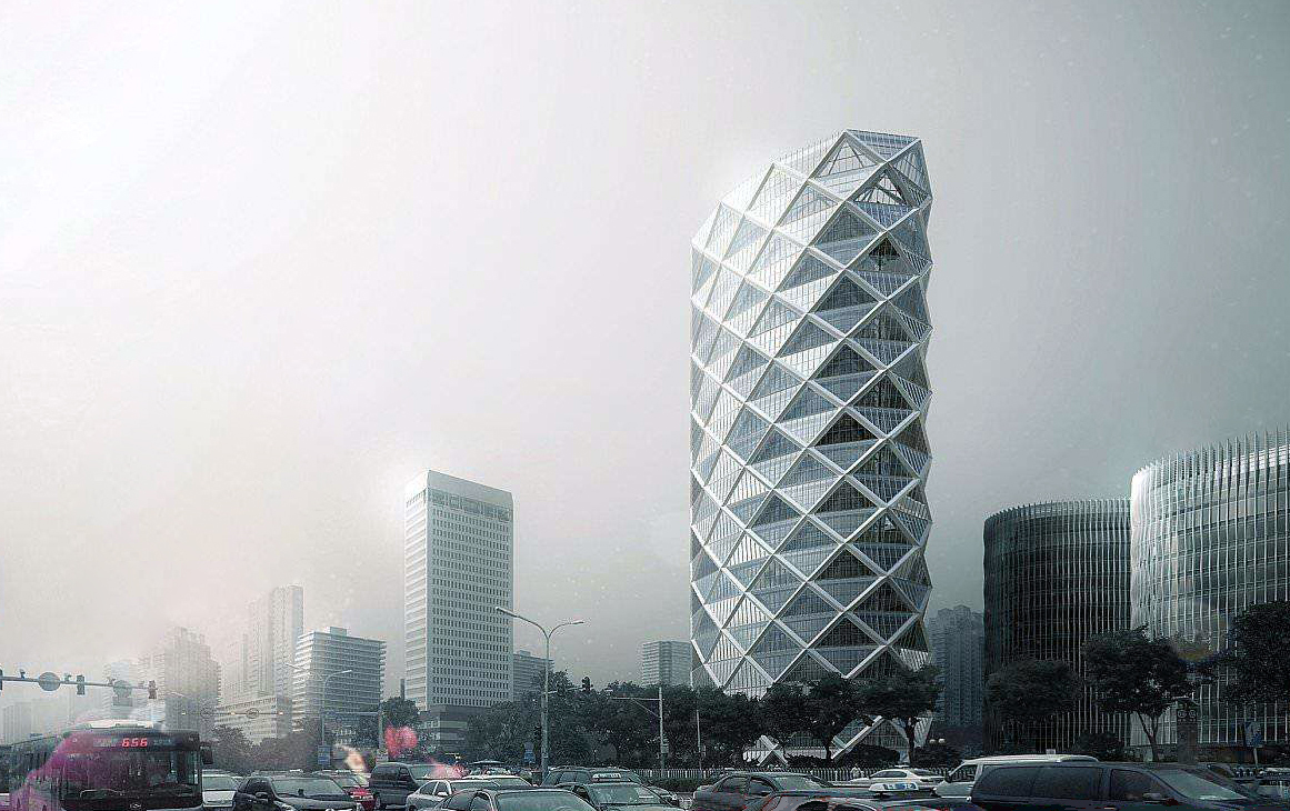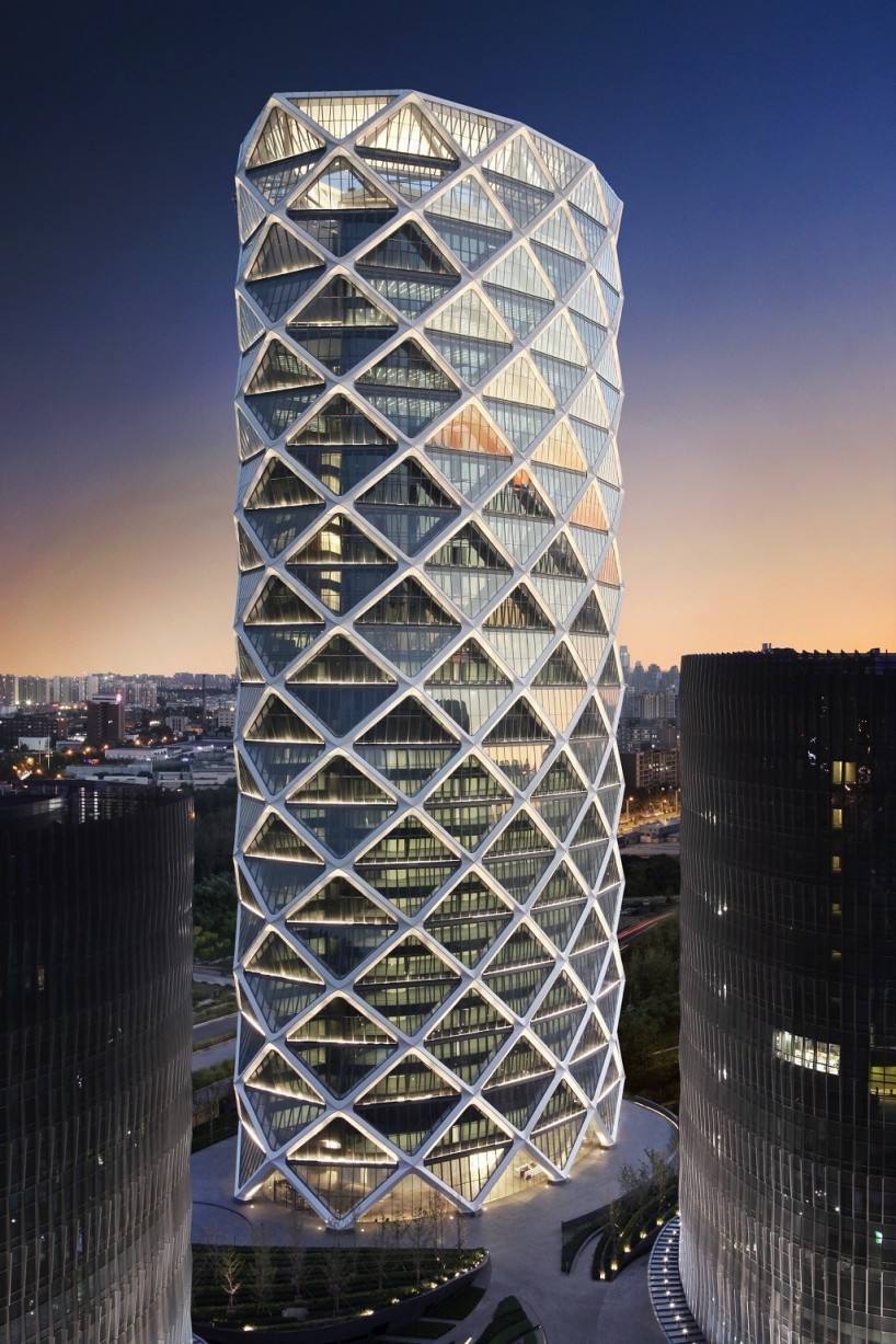 建筑方案由美国SOM公司设计。其中T1楼按建筑结构采用钢管混凝土柱交叉网格外筒和钢筋混凝土内筒组成的筒中筒结构,外框筒由约45°角交叉编织的钢管混凝土斜网格和水平环梁组成,总体钢结构用量超过1万吨。全楼竖向无柱设计,内外框筒间每两层相连,楼盖隔层悬吊;大堂主入口上方127米的通高中庭效果震撼,但造成各层平面结构不连续;中庭顶部有6层高旋转楼梯悬挑跨度10米;结构平面、竖向均不规则。处处都充满建筑独特趣味,同时也是对结构的巨大挑战。